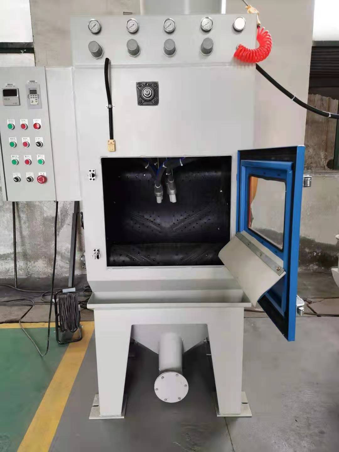 7、 由空轉(zhuǎn)計時器控制吹氣,可設(shè)定空轉(zhuǎn)吹氣時間,以清潔工件,并使砂材回收更徹底。